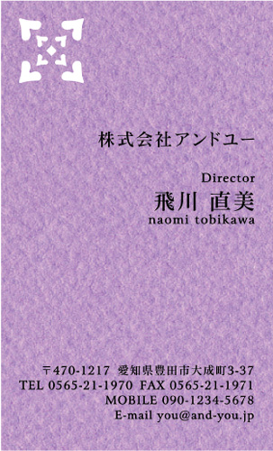 左上の型抜き部分が、かっこいい! 紫色の紙の色にマッチしたデザインがいいね! あと、文字の配置も超クール! 和風な感じがするね! 紙のモコモコした感じと紫色もマッチしてるね! 舞妓さんや京都の女性などに合いそうなデザインだね! 名前にローマ字も書いてるのが、国際的で日本人以外の方にと交流があるかたに向いてるかも?文字の配置も日本風な「わび」「さび」を感じてグッドだね! | |