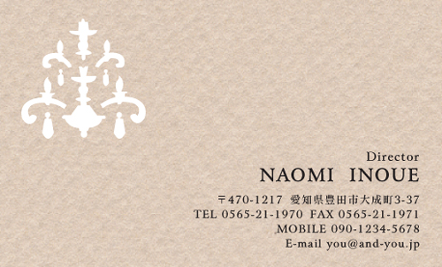 薄いピンク色を下地に、型抜きしたシャンデリアがヨーロッパの伝統と威厳のある建築物を思い浮かばせ、高級感とステータスあふれた名刺だと思わせますね。 ラグジュアリーなサービスを展開している企業様や個人には御似合いですね。 お客様に高い顧客満足度をご奉仕しているサービス業の企業様がこの名刺を使って頂ければ、お客様のステータス精神が向上し、企業様の売上高アップ間違えなしですね。 | |