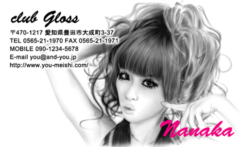 スゴクカワイイです♪ モノクロっていうのもカッコイイです♪ 勝負写真が撮れたらこれですね! これだったらage嬢のなかでも目立てますもん♪ 源氏名だけショッキングピンクっていうのもカッコイイな♪ 左下に空白があるから、一言書いたらお客さまも喜んでくれるかな♪ でもこんな綺麗に印刷してくれたら使うのもったいない気もするけど♪ | |