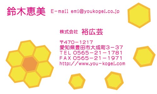 白色の下地にカラフルな色がポップでキュートですね。 黄色にオレンジの枠が付いた正六角形があつまってお花の形になっていて素敵です。 まるで、ブロックで作ったおもちゃを思い出し、子供の無邪気だった思い出を懐かしむことができます。 氏名等を印字している濃いピンク色も派手派手しくなく、オシャレな感じの仕上がりで好感がもてます。 | |