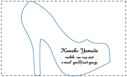 変わった形の名刺で「切り抜き名刺」ってジャンルがあったのですが、その中でハイヒールの形をした名刺があって、気に入りました! 文字の形も靴に合っているねと思いました。 特に名前がローマ字でかわいい感じがするし、クールな感じがします。 ビジネスでなく、飲み会や友達に配る時にいいかも。 あと、靴屋さんんに努めてる女性にもおすすめかな? | |