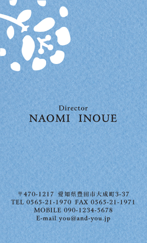 左上にある花は、切り絵のような少し単純化したフォルムで、型抜きにはぴったりですね。 ブルーの紙を使っているので、全体としてはとても落ち着いた印象になっていて、知的な感じがします。 また、ちょっとザラッとしたような紙の質感も型抜きと相性がいいように思います。 プライベート名刺はもちろん、これなら、ビジネス名刺としても、使えるのではないでしょうか? | |