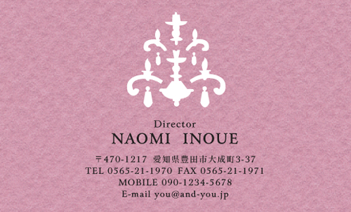 すごく鮮やかなカラーの名刺でかわいいです。 メインである王冠をあえて白でシンプルに描いて、ふんだんに使ったラインストーンでラグジュアリー感を出す。 バランスがいいですよね。 ラインストーンの色も背景の鮮やかな赤ととてもマッチしていると思います。 全体的にシンプルながらラインストーンのおかげで高級感が出ているデザインですね。 | |