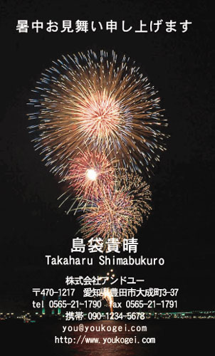 良いですね。 夜空の花火わ! 華麗に咲いた花々の様に、カードの中のものでも見入ってしまいます。 花火は子供から大人、男、女と誰もが楽しめますね。 それに人の心には花火大会などの思い出など、誰しももっていると思いますので、この一枚のカードで色々な角度からいろんな出来事を思い浮かべられ、それがデザインとして使われていて良いと思います。 | |