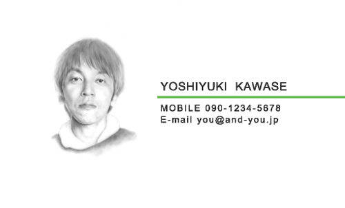 似顔絵と言うとマンガ調のものを思い浮かべてしまいますが、こんなものもあるんですね。 顔がデッサンのような感じで描かれて、個性が柔らかく表現されているのがいいですね。 写実的ではありますが、写真とはひと味違う味わいです。 デザイン的には、すっきりシンプル。 そんな中で、グリーンのラインが、ワンポイントアクセントとして、とてもよく効いていますね。 | |