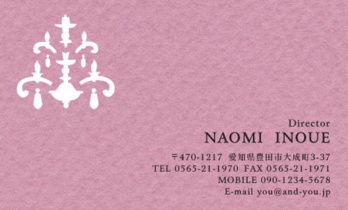 ゴージャスなシャンデリアが型抜きされたこの名刺、かなり気に入りました。 型抜き名刺をつくるなら、ありきたりなモチーフじゃなくて、こんなちょっと珍しいモチーフのものがいいと思います。 文字情報は、右下にすっきりコンパクトにまとめられ、シャンデリアとは対角線上にあるような配置になっているので、見た目のバランスがいいですね。 | |
