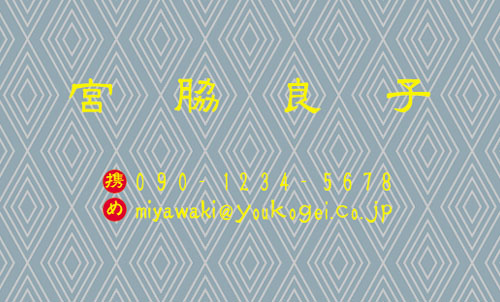 背景がグレイ基調で菱形の規則性のある柄なので厳かで落ち着きと調和がある感じがして、少し渋目な感覚の雰囲気が良いと思います。 黄色で書かれた文字が良く映えていて、目立って良い。 文字のレイアウトも広くとっているので、非常に見やすいので、名刺としての機能も十分あり良いです。 そして、隠し味の様なメールの「め」が遊び心も感じられ良いと思います。 | |