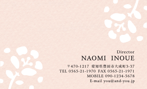 着物の着付け教室や生け花教室と言った所の先生が持っていそうな名刺ですね。 それ以外でもそういった趣味を持っている場合でも合いそうです。 白い花がこちらを向いて咲いているところが、何か元気を与えてくれるようで力を付けてくれます。 バックが茶色になっている所が意外な気が初めはしましたが、全体をしばらく見ていると、土のイメージを感じさせてくれるので、温かみと安らぎのような印象を感じます。 | |