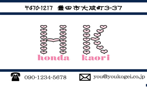 ここまで手づくり風に徹するなんて、ある意味、すごいですね! 中学生の頃、友達同士で名刺を手づくりして、お互いに交換して遊んだりしてましたけど、そんな頃を思い出しちゃいました。 この名刺のデザインには、そんなぬくもりが感じられます。 ハートのイニシャルが可愛いですし、紺色のラインの入れ方なんかも、いかにも手作り風でいいですね。 遊び感覚のセカンド名刺として、楽しく使えるんじゃないかと思います。 | |