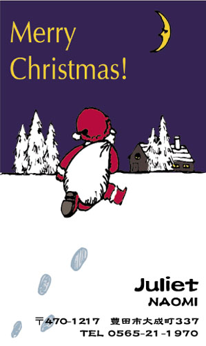 サンタさんが面白いことやってますね。 コミカルに描かれているのが気に入りました。 暖炉で靴下乾かしていますが、どこから家に入ったのでしょうか?季節ものですから名刺も暑中見舞いみたいになってきているんですね~今の流行を知っておきたいので。 クリスマスの夜空とサンタさんがいる家の中とうまいこと分かれていますね。 可愛らしいイラストですね。 | |