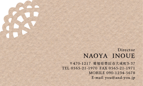 ベージュ色を背景に、この名刺に高級感とステータスを感じてしまいます。 ベージュ色が醸し出す、穏やかで、優しく、癒しを感じます。 ベージュを基調とした建築物なんかはステータス且つ、高級というイメージがあると思います。 ディレクターという横文字の肩書きにかっこよさをも感じてしまいます。 建築インテリア関係の職業の方の名刺にはぴったりではと思います。 | |