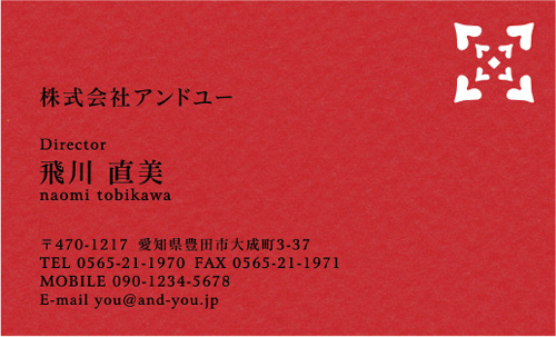 コーナー部分の型抜きが面白い! ワンポイントきいていますね~。 ただ四角とかにするんじゃなくって、ハートになっているのもこれまた良いと思います。 真っ赤な用紙も情熱的でとってもカッコいいと思いますしね~! ! 名前は読みやすい字体で変に装飾をしていないから、とっても使い勝手が良いとおもいます。 こういう名刺、もっと増えればいいのになあ~。 | |