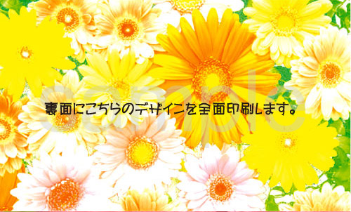 私が今まで使っていた名刺は裏面は何の模様も無く、真っ白でした。 「まぁ、ビジネスに使うものだからいっか」と考えていたのですがやっぱり真っ白は少し寂しいなと思い裏面にも模様を入れることにしました。 この花のデザインはオレンジやピンクが使われていて、実物も写真以上にすごく鮮やかです。 渡した相手にもよく綺麗な名刺だねって褒められます♪ | |