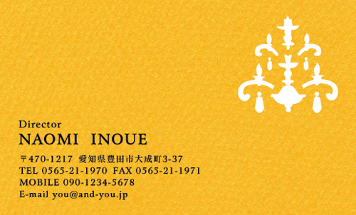 この名刺は、温かみがあり、かつシャープな印象を与えてくれる。 抜きのデザインも細かくて、丁寧さと繊細さをも思わせる高度なデザインです。 下地の黄色も、単なるベタ塗りの一色ではなく、細かい、カーペットを連想させるものとなっています。 それは即ち、部屋のシャンデリアが灯され、部屋が明るくなりカーペットが美しく見える事を示し、引いては家庭的な人だという印象を与えることに貢献していると思います。 | |