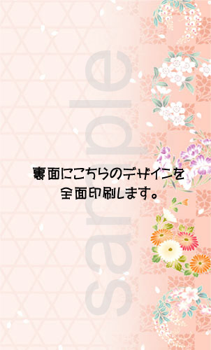 和風で可憐な裏面デザイン名刺ですね。 やっぱりピンクに和柄は女の子の憧れだと思います。 またグラデーションで格子と花がいいバランスで配置されていてグッドデザインですね。 右側の花は全部違う種類なのも凝ってる感じ。 また花びらが散っているのもいいですねえ。 左側にはさっとメッセージなども添えれそうで使い方が広がる名刺ですね。 | |