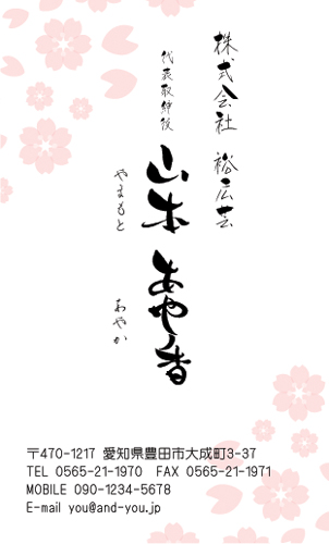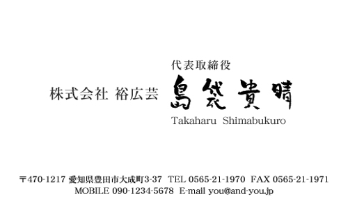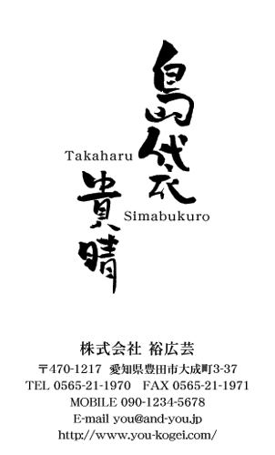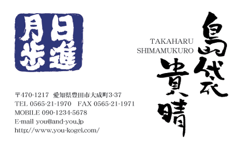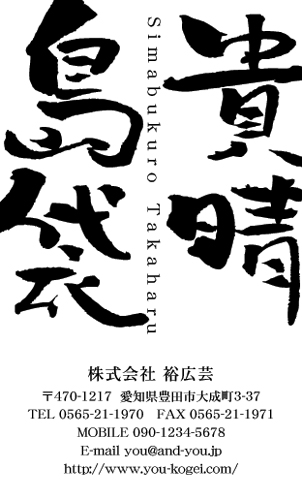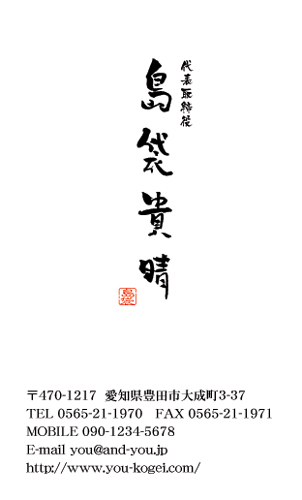 【自己紹介】 19歳から詩を書き始め、23歳の時にオーストラリアを自転車で1万キロ走破し その時に出逢ったたくさんの人々の影響を受け、帰国後24歳から名古屋の路上にて詩を書き始めました。 想いを言葉に変えたくさんの人に届けられたらと当時の気持ちのまま今尚筆を持ち心を綴っています。 ブログ「ことばの工房」 料金(1作品):文字 3,850円+名刺作成料 作成にかかる時間:約5日(状況により前後あり)/筆文字修正あり) *筆文字のキャンセルはできません。 ※筆文字は主に、デザインサンプルの筆文字部分(氏名)を書家が書きます。 ※字体を変更する等、大幅な変更の場合は追加料金1,000円が発生致します。 ※字体のご希望がございます場合は、ご注文時に予めお申し付け下さい。 | |