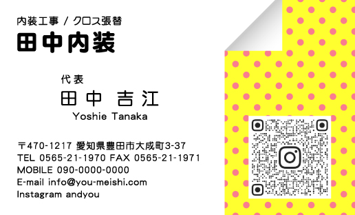 クロス屋・内装業 名刺デザイン kurosu-CA-005 カテゴリ > クロス屋・内装業 名刺デザイン 少しめくれた壁紙が特徴的なクロス屋・内装業さん向けの名刺デザインです。かわいいドット柄がポイント。 表 イメージ ※オンマウスで拡大表示いたします。 サイズ 91mm × 55mm このデザインで注文する このデザインでFAX注文 裏面デザインについて このデザインをお気に入りに追加 この商品に対するお問い合わせ 色違いデザイン kurosu-CA-004 簡単料金計算 用紙を選択 ハイトーン (最もスタンダードな白い用紙) 光沢紙 ※両面印刷不可 ※ラインストーン不可半透明(トレーシングペーパー) ※両面印刷不可 ※ラインストーン不可半透明(NTパイル) ※両面印刷不可 ※ラインストーン不可 枚数を選択 203050100150200300400500 金額をチェック 送料はこちら レビューコメント レビュー・コメントはまだありません。 閉じる レビューをお書きください このデザインのレビュー(ご感想)をぜひご記入ください レビュー入力欄 レビューは不特定多数の方がご覧になりますので、 個人情報などを含まれないようにご注意ください。 投稿していただいた内容について、弊社で不適切と判断した場合には、 お断りなく非掲載とさせていただく場合がございます。 レビュー記入者の種別 閲覧者 購入者 レビュー記入者の名前(ニックネーム) 下の数字を入力: