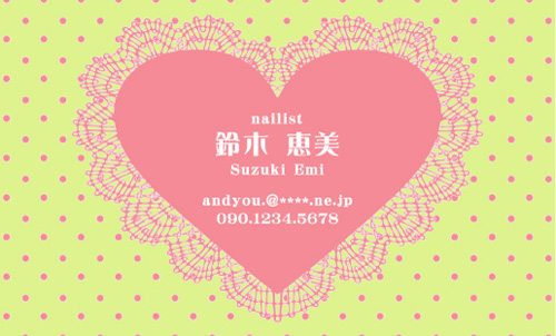 職業別名刺:ネイリスト nailist-AY-CU-010 カテゴリ > ネイルサロン・ネイリスト 名刺デザイン 表 ※オンマウスで拡大表示いたします。 サイズ 91mm × 55mm このデザインで注文する このデザインでFAX注文 裏面デザインについて このデザインをお気に入りに追加 この商品に対するお問い合わせ 色違いデザイン nailist-AY-CU-008nailist-AY-CU-009 簡単料金計算 用紙を選択 ハイトーン (最もスタンダードな白い用紙) マイルド (白味を少し抑えたオフホワイトの用紙) サニー (クリーム色の用紙) 光沢紙 ※両面印刷不可 ※ラインストーン不可半透明(トレーシングペーパー) ※両面印刷不可 ※ラインストーン不可半透明(NTパイル) ※両面印刷不可 ※ラインストーン不可 枚数を選択 203050100150200300400500 金額をチェック 送料はこちら レビューコメント 2 件のレビュー・コメントがあります。 なつみ 様(閲覧者) 2017年10月05日 カーテンレースのような模様の柄でとても可愛らしいです。見ていて心が... 続きを読む なつみ 様(閲覧者) 2017年10月05日 カーテンレースのような模様の柄でとても可愛らしいです。見ていて心が晴れ晴れとして来ますね。街中にショッピングに来た時のような、華やかで明るい気持ちになりました。ハートのマークが描かれているのもよりキュートさが増して良いですね。ドキドキ、ギュッギュッ。甘い気持ちが脳裏を掠めます。本物の服を身にまとっているかのような、新鮮でパワフルな気持ちになりました。 マリン 様(閲覧者) 2013年04月25日 レースとかハートマークを使ったデザインってピンク系が多いんですよね~。私は青色がすきなのでこういうデザインを探していたんです!全て青系等でまとめられているので、もう堪りませんね。(笑)背景のドットもキュートだし、名前とかが書かれている文字のデザインも可愛い。ハートとレースが女の子らしさをアピールしていてGOOD! 閉じる レビューをお書きください このデザインのレビュー(ご感想)をぜひご記入ください レビュー入力欄 レビューは不特定多数の方がご覧になりますので、 個人情報などを含まれないようにご注意ください。 投稿していただいた内容について、弊社で不適切と判断した場合には、 お断りなく非掲載とさせていただく場合がございます。 レビュー記入者の種別 閲覧者 購入者 レビュー記入者の名前(ニックネーム) 下の数字を入力: