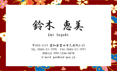 和風デザイン名刺 NI-WA-160 カテゴリ > 和風デザイン・和柄 名刺デザイン 表 ※オンマウスで拡大表示いたします。 サイズ 91mm × 55mm このデザインで注文する このデザインでFAX注文 裏面デザインについて このデザインをお気に入りに追加 この商品に対するお問い合わせ 色違いデザイン NI-WA-158NI-WA-159NI-WA-161 簡単料金計算 用紙を選択 ハイトーン (最もスタンダードな白い用紙) マイルド (白味を少し抑えたオフホワイトの用紙) サニー (クリーム色の用紙) グレイ (緑がかった明るい灰色の用紙) 光沢紙 ※両面印刷不可 ※ラインストーン不可半透明(トレーシングペーパー) ※両面印刷不可 ※ラインストーン不可半透明(NTパイル) ※両面印刷不可 ※ラインストーン不可厚紙:オフホワイト 枚数を選択 203050100150200300400500 金額をチェック 送料はこちら レビューコメント 2 件のレビュー・コメントがあります。 きくえ 様(閲覧者) 2017年06月22日 お花、なでしこ、蝶のデザインの障子柄が額縁に使われていて優雅な感じ... 続きを読む きくえ 様(閲覧者) 2017年06月22日 お花、なでしこ、蝶のデザインの障子柄が額縁に使われていて優雅な感じがします。深緑を母体に青、ピンク、オレンジ、白で、お花やなでしこ、蝶がちらばめている配色も落ち着きがありとってもいいですね。名前は筆字で程よい大きさで書かれており、「称」と「名」の間に空白が設けられているので読みやすいですね。名前も住所などの連絡先は中央で揃っているので文字は明確に読み取ることが出来ますね。 撫子 様(閲覧者) 2015年12月12日 和風の縁取りがあしらわれているんですね。蝶や花柄が型押しされてるようにも見えて素敵です。昔の人は千代紙で白い台紙に縁取り細工などして、一筆箋にしたようですがそれを彷彿とさせますね。ノスタルジーを感じてしまいます。キチッとした名前のフォントも背筋が伸びます。まるで明治の女性ってイメージの名刺だと思いました。和柄好きには堪らない魅力を放っていますよ! 閉じる レビューをお書きください このデザインのレビュー(ご感想)をぜひご記入ください レビュー入力欄 レビューは不特定多数の方がご覧になりますので、 個人情報などを含まれないようにご注意ください。 投稿していただいた内容について、弊社で不適切と判断した場合には、 お断りなく非掲載とさせていただく場合がございます。 レビュー記入者の種別 閲覧者 購入者 レビュー記入者の名前(ニックネーム) 下の数字を入力: 関連デザイン penki-ay001 penki-ay002 penki-ay003 penki-ay004 penki-ay005 penki-ay006 aisq031 aisq032 aisq033 aisq034 ayas004 aycu047