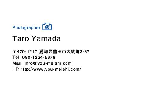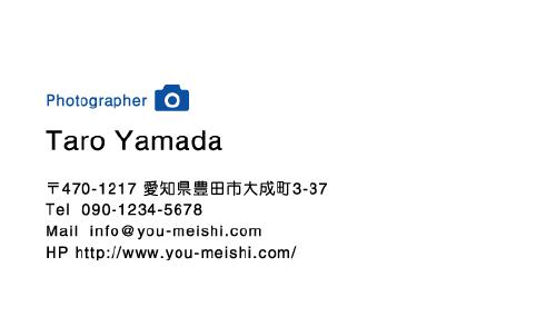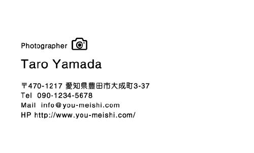 職業別名刺:フォトグラファー・写真家・映像関係 photographer-NI-002 カテゴリ > カメラマン・フォトグラファー・写真家 名刺デザイン 表 ※オンマウスで拡大表示いたします。 サイズ 91mm × 55mm このデザインで注文する このデザインでFAX注文 裏面デザインについて このデザインをお気に入りに追加 この商品に対するお問い合わせ 色違いデザイン photographer-NI-006photographer-NI-005photographer-NI-004photographer-NI-003 photographer-NI-001 簡単料金計算 用紙を選択 ハイトーン (最もスタンダードな白い用紙) マイルド (白味を少し抑えたオフホワイトの用紙) サニー (クリーム色の用紙) グレイ (緑がかった明るい灰色の用紙) クラフト紙 (ざらっとした質感のクラフト紙) 光沢紙 ※両面印刷不可 ※ラインストーン不可和紙(両面新大礼紙) (両面にレーヨン繊維が漉き込まれています) 半透明(トレーシングペーパー) ※両面印刷不可 ※ラインストーン不可半透明(NTパイル) ※両面印刷不可 ※ラインストーン不可厚紙:オフホワイト 厚紙:薄ピンク 厚紙:薄クリーム 厚紙:薄みず色 厚紙:薄みどり色 厚紙:グレイ 厚紙:キャメル 厚紙:マスタード 枚数を選択 203050100150200300400500 金額をチェック 送料はこちら レビューコメント 2 件のレビュー・コメントがあります。 きまぐれん 様(閲覧者) 2019年08月18日 とーってもシンプルなデザインなのに、フォトグラファーの文字とカメラ... 続きを読む きまぐれん 様(閲覧者) 2019年08月18日 とーってもシンプルなデザインなのに、フォトグラファーの文字とカメラアイコンの赤色のワンポイントがいいアクセントになってカジュアルさもあり、オシャレ度の高いデザインだと思いました!フォトグラファー名刺だけど凝ったデザインではなくあえてホワイトベースな所がいいですよね~ カメラ小僧 様(閲覧者) 2019年02月18日 シンプルなだけに、腕の良さを表していますね。無駄なものはいらないスタイルでカッコイイ。カメラのイラストだけが入っているのも、職業が解りやすくて良いですね。プロって感じがします。 閉じる レビューをお書きください このデザインのレビュー(ご感想)をぜひご記入ください レビュー入力欄 レビューは不特定多数の方がご覧になりますので、 個人情報などを含まれないようにご注意ください。 投稿していただいた内容について、弊社で不適切と判断した場合には、 お断りなく非掲載とさせていただく場合がございます。 レビュー記入者の種別 閲覧者 購入者 レビュー記入者の名前(ニックネーム) 下の数字を入力: 関連デザイン penki-ay001 penki-ay002 penki-ay003 penki-ay004 penki-ay005 penki-ay006 kensetu-ni023 kensetu-ni025 niqr001 niqr002 nis017 nis022