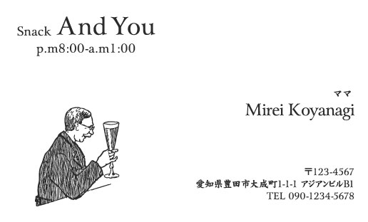 スナック・スナック ママ 名刺デザイン snack-HS-008 カテゴリ > スナック・スナック ママ 名刺デザイン オジサンがキュートな一枚★ 表 イメージ ※オンマウスで拡大表示いたします。 サイズ 91mm × 55mm このデザインで注文する このデザインでFAX注文 裏面デザインについて このデザインをお気に入りに追加 この商品に対するお問い合わせ 色違いデザイン snack-HS-010snack-HS-009snack-HS-007 簡単料金計算 用紙を選択 ハイトーン (最もスタンダードな白い用紙) マイルド (白味を少し抑えたオフホワイトの用紙) サニー (クリーム色の用紙) クラフト紙 (ざらっとした質感のクラフト紙) 光沢紙 ※両面印刷不可 ※ラインストーン不可半透明(トレーシングペーパー) ※両面印刷不可 ※ラインストーン不可半透明(NTパイル) ※両面印刷不可 ※ラインストーン不可厚紙:オフホワイト 厚紙:薄ピンク 枚数を選択 203050100150200300400500 金額をチェック 送料はこちら レビューコメント レビュー・コメントはまだありません。 閉じる レビューをお書きください このデザインのレビュー(ご感想)をぜひご記入ください レビュー入力欄 レビューは不特定多数の方がご覧になりますので、 個人情報などを含まれないようにご注意ください。 投稿していただいた内容について、弊社で不適切と判断した場合には、 お断りなく非掲載とさせていただく場合がございます。 レビュー記入者の種別 閲覧者 購入者 レビュー記入者の名前(ニックネーム) 下の数字を入力: