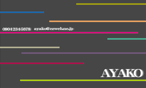 かわいい名刺 ST-CU-005 カテゴリ > かわいいデザイン名刺 表 ※オンマウスで拡大表示いたします。 サイズ 91mm × 55mm このデザインで注文する このデザインでFAX注文 裏面デザインについて このデザインをお気に入りに追加 この商品に対するお問い合わせ 色違いデザイン ST-CU-004 簡単料金計算 用紙を選択 ハイトーン (最もスタンダードな白い用紙) サニー (クリーム色の用紙) 光沢紙 ※両面印刷不可 ※ラインストーン不可半透明(トレーシングペーパー) ※両面印刷不可 ※ラインストーン不可半透明(NTパイル) ※両面印刷不可 ※ラインストーン不可 枚数を選択 203050100150200300400500 金額をチェック 送料はこちら レビューコメント 2 件のレビュー・コメントがあります。 かなかな 様(閲覧者) 2023年04月07日 カラフルラインがすごい可愛い!躍動感やばいです!大人っぽいワインレ... 続きを読む かなかな 様(閲覧者) 2023年04月07日 カラフルラインがすごい可愛い!躍動感やばいです!大人っぽいワインレッドにカラフルなラインはめっちゃマッチしてる!!名前の感じが何となく走ってる感じがあって面白いです! すけしん 様(閲覧者) 2014年09月04日 ブラックの背景にたくさんの長さの違う様々な色を使った名刺の端からシャープに引かれているラインが夜空に流れる彗星群の様で非常に美しく、想像力をふくらまされ、シンプルでありながらなにか魅力的なものが感じられる名刺です。名前もローマ字で丁度明るい黄緑色の長いラインの上にレイアウトされていてスタイリッシュさがあってお洒落な名刺で良いです。 閉じる レビューをお書きください このデザインのレビュー(ご感想)をぜひご記入ください レビュー入力欄 レビューは不特定多数の方がご覧になりますので、 個人情報などを含まれないようにご注意ください。 投稿していただいた内容について、弊社で不適切と判断した場合には、 お断りなく非掲載とさせていただく場合がございます。 レビュー記入者の種別 閲覧者 購入者 レビュー記入者の名前(ニックネーム) 下の数字を入力: 関連デザイン penki-ay001 penki-ay002 penki-ay003 penki-ay004 penki-ay005 penki-ay006 aice003 aice004 aice010 aico021 aico022 aico025