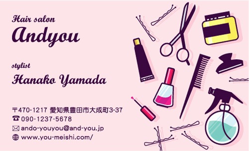 職業別名刺:スタイリスト stylist-AY-001 カテゴリ > 美容師・スタイリスト・ヘアメイク 名刺デザイン 表 ※オンマウスで拡大表示いたします。 サイズ 91mm × 55mm このデザインで注文する このデザインでFAX注文 裏面デザインについて このデザインをお気に入りに追加 この商品に対するお問い合わせ 色違いデザイン stylist-AY-002stylist-AY-003 簡単料金計算 用紙を選択 ハイトーン (最もスタンダードな白い用紙) マイルド (白味を少し抑えたオフホワイトの用紙) サニー (クリーム色の用紙) 光沢紙 ※両面印刷不可 ※ラインストーン不可半透明(トレーシングペーパー) ※両面印刷不可 ※ラインストーン不可半透明(NTパイル) ※両面印刷不可 ※ラインストーン不可厚紙:オフホワイト 枚数を選択 203050100150200300400500 金額をチェック 送料はこちら レビューコメント 1 件のレビュー・コメントがあります。 EMI 様(閲覧者) 2025年05月10日 道具など、どんな仕事かわかる名刺って良いですね!イラストも可愛らし... 続きを読む EMI 様(閲覧者) 2025年05月10日 道具など、どんな仕事かわかる名刺って良いですね!イラストも可愛らしくて良いと思います!文字色も黒じゃなく、紫っぽい色にすることで、野暮ったい感じも薄まって、おしゃれになりますね~ 閉じる レビューをお書きください このデザインのレビュー(ご感想)をぜひご記入ください レビュー入力欄 レビューは不特定多数の方がご覧になりますので、 個人情報などを含まれないようにご注意ください。 投稿していただいた内容について、弊社で不適切と判断した場合には、 お断りなく非掲載とさせていただく場合がございます。 レビュー記入者の種別 閲覧者 購入者 レビュー記入者の名前(ニックネーム) 下の数字を入力: 関連デザイン penki-ay001 penki-ay002 penki-ay003 penki-ay004 penki-ay005 penki-ay006 aice001 aice002 aice003 aice004 aice007 aice008