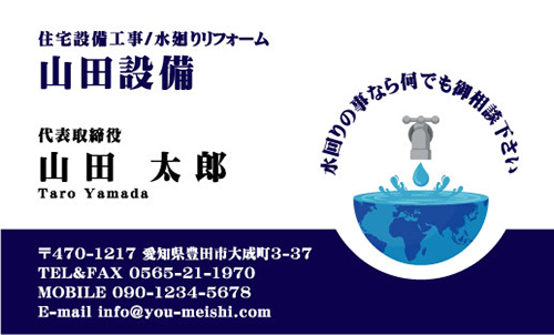 水道屋・水道工事店・水道設備屋 suidou-NI-032 カテゴリ > 水道屋・水道工事店・水道設備屋 名刺デザイン 地球と蛇口を名刺にデザインしました。 表 イメージ ※オンマウスで拡大表示いたします。 サイズ 91mm × 55mm このデザインで注文する このデザインでFAX注文 裏面デザインについて このデザインをお気に入りに追加 この商品に対するお問い合わせ 色違いデザイン suidou-NI-031 簡単料金計算 用紙を選択 ハイトーン (最もスタンダードな白い用紙) 光沢紙 ※両面印刷不可 ※ラインストーン不可半透明(トレーシングペーパー) ※両面印刷不可 ※ラインストーン不可半透明(NTパイル) ※両面印刷不可 ※ラインストーン不可 枚数を選択 203050100150200300400500 金額をチェック 送料はこちら レビューコメント レビュー・コメントはまだありません。 閉じる レビューをお書きください このデザインのレビュー(ご感想)をぜひご記入ください レビュー入力欄 レビューは不特定多数の方がご覧になりますので、 個人情報などを含まれないようにご注意ください。 投稿していただいた内容について、弊社で不適切と判断した場合には、 お断りなく非掲載とさせていただく場合がございます。 レビュー記入者の種別 閲覧者 購入者 レビュー記入者の名前(ニックネーム) 下の数字を入力: