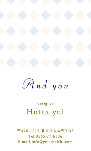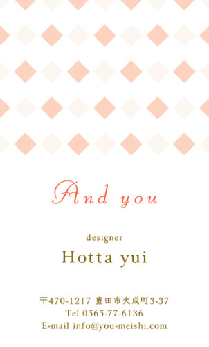 かわいい名刺 YH-CU-053 カテゴリ > かわいいデザイン名刺 表 ※オンマウスで拡大表示いたします。 サイズ 91mm × 55mm このデザインで注文する このデザインでFAX注文 裏面デザインについて このデザインをお気に入りに追加 この商品に対するお問い合わせ 色違いデザイン YH-CU-052YH-CU-054 簡単料金計算 用紙を選択 ハイトーン (最もスタンダードな白い用紙) マイルド (白味を少し抑えたオフホワイトの用紙) サニー (クリーム色の用紙) 光沢紙 ※両面印刷不可 ※ラインストーン不可厚紙:オフホワイト 枚数を選択 203050100150200300400500 金額をチェック 送料はこちら レビューコメント 1 件のレビュー・コメントがあります。 あい 様(閲覧者) 2017年05月14日 とっても素敵な名刺ですね。こういう優しい色使いで可愛いのに信頼性が... 続きを読む あい 様(閲覧者) 2017年05月14日 とっても素敵な名刺ですね。こういう優しい色使いで可愛いのに信頼性があるデザインが大好きです。縦長の洋風な名刺もいいですね。淡いピンクと淡い緑の上半分のデザインが私は特に気に入りました。英文字の書体と色のバランスがすごく上手くとれてますね。住所や電話番号などの連絡先が読みやすい文字で助かります。文字と文字の余白の量も程よくあり、文字は中央で揃えてあるのでとっても見やすいです。 閉じる レビューをお書きください このデザインのレビュー(ご感想)をぜひご記入ください レビュー入力欄 レビューは不特定多数の方がご覧になりますので、 個人情報などを含まれないようにご注意ください。 投稿していただいた内容について、弊社で不適切と判断した場合には、 お断りなく非掲載とさせていただく場合がございます。 レビュー記入者の種別 閲覧者 購入者 レビュー記入者の名前(ニックネーム) 下の数字を入力: 関連デザイン penki-ay001 penki-ay002 penki-ay003 penki-ay004 penki-ay005 penki-ay006 aice010 ais022 aisq049 akce07 akce085 akko005