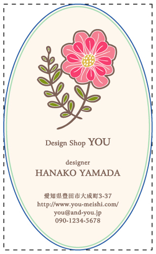 花のデザインと色味がとっても可愛いです! 背景のアイボリーとのバランスも素敵です! 楕円に切り抜きがされるのが、優しい雰囲気をアップさせますね! 可愛いが詰まった名刺ですね! | |