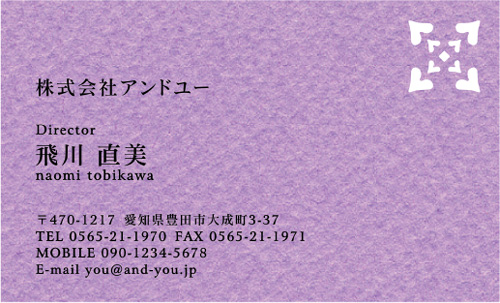 高級感とステータスや階級を思い浮かばせる紫を下地に、右上にロゴを型抜きし、日本の伝統文化を継承した企業に思えます。 和へのこだわりと匠の技を備えた日本の芸術を扱った企業だと顧客に訴求すると思います。 日本の伝統文化を扱う企業でも、歴史が浅く、ブランド力が弱くても、この名刺の紫がステータスと高級感を醸し出し、この企業の秘めた実力を開花してくれると思います。 新規顧客もきっとこの名刺があれば、訴求できると思います。 | |